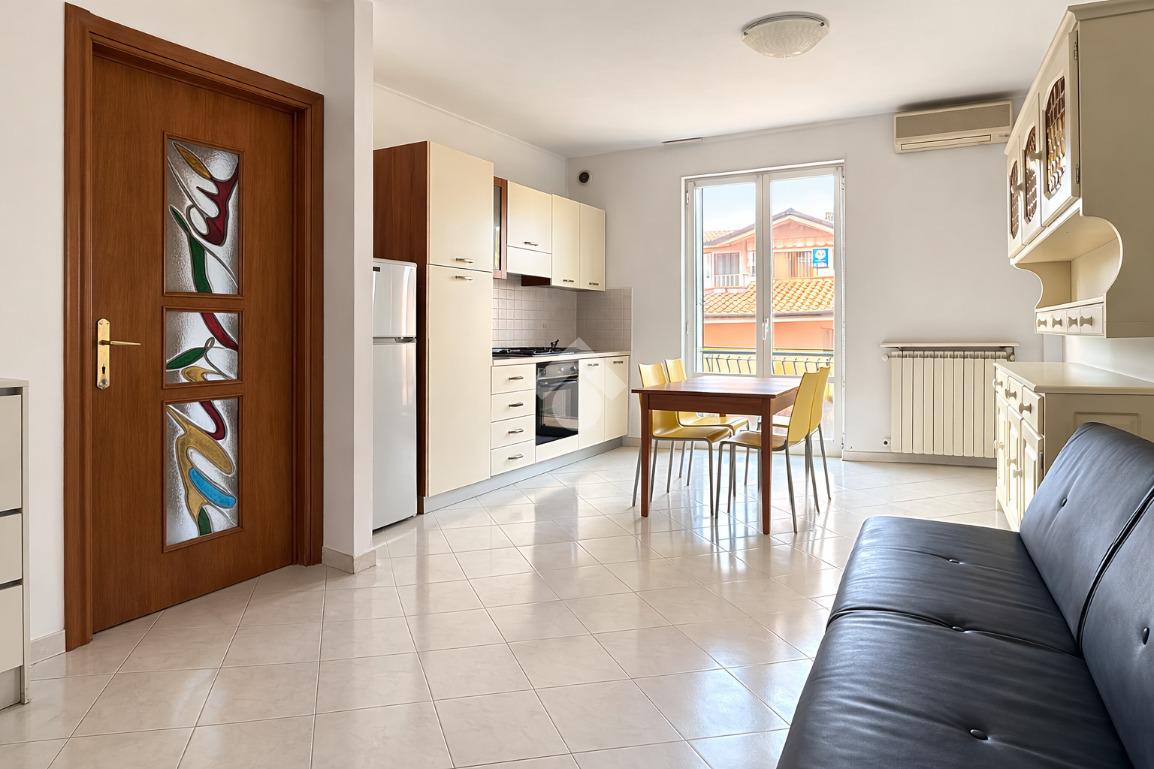 L’appartamento offre posto auto assegnato e un parcheggio ospiti per brevi soste. L’ingresso conduce in un luminoso open space soggiorno-cucina, con accesso a un ampio balcone.
